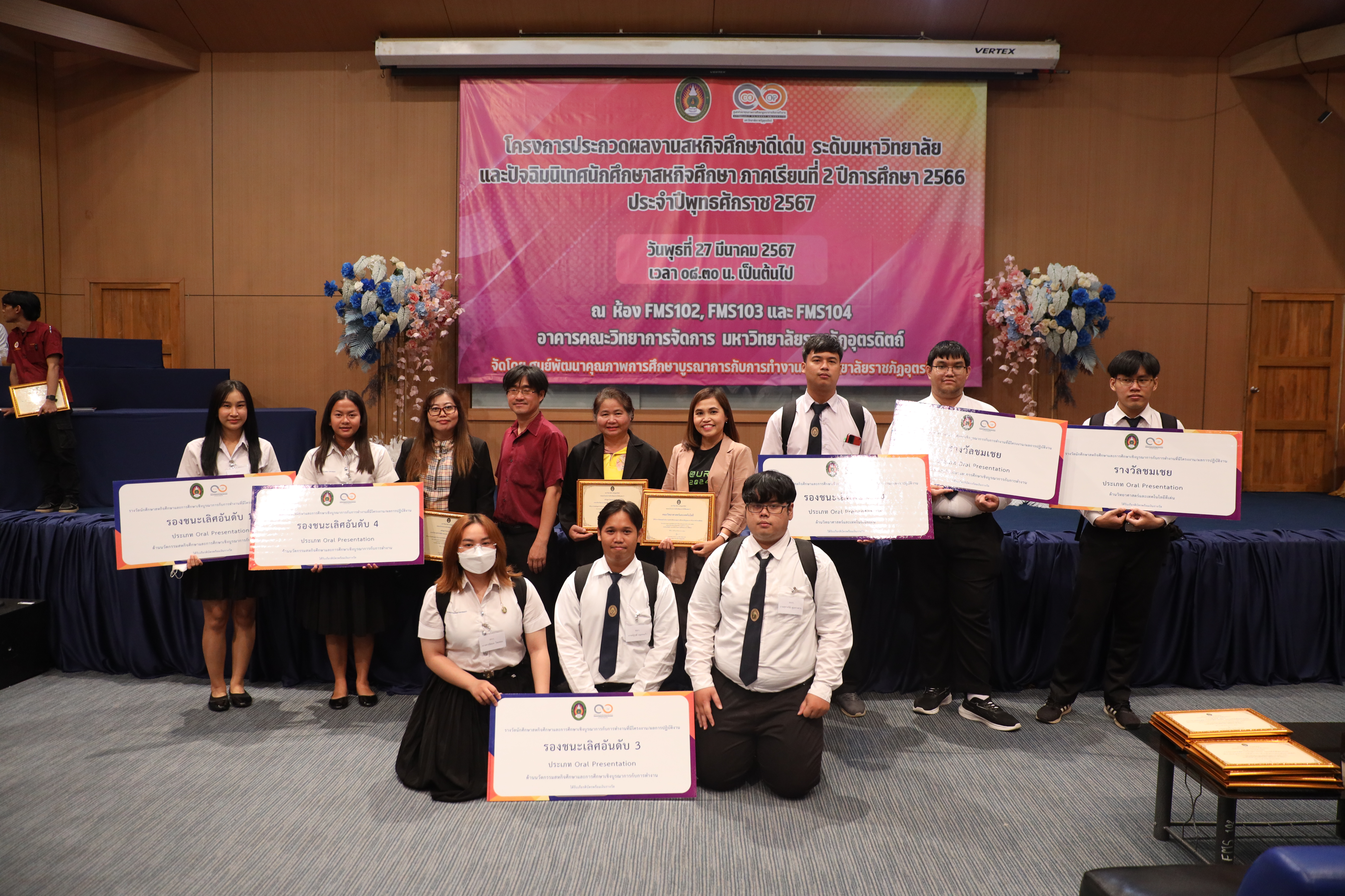 วันที่ 27 มีนาคม 2567 ศูนย์พัฒนาคุณภาพการศึกษาบูรณาการกับการทำงาน มหาวิทยาลัยราชภัฏอุตรดิตถ์ จัดกิจกรรมปัจฉิมนิเทศนักศึกษาสหกิจศึกษา ภาคเรียนที่ 2 ปีการศึกษา 2566 และการประกวดผลงานสหกิจศึกษาดีเด่น ระดับมหาวิทยาลัย ประจำปี 2567 เพื่อคัดเลือกผลงานนักศึกษาเข้าร่วมการประกวดผลงานสหกิจศึกษาดีเด่น ระดับเครือข่ายภาคเหนือตอนล่าง ประจำปี พ.ศ. 2567 โดยได้รับเกียรติจาก ผศ.ธนัตถา กรพิทักษ์ รองอธิการบดีมหาวิทยาลัยราชภัฏอุตรดิตถ์ เป็นประธานในการมอบรางวัลให้แก่นักศึกษาที่เข้าประกวดและอาจารย์ที่ปรึกษาโครงการ ภาพ/ข่าว PR URU