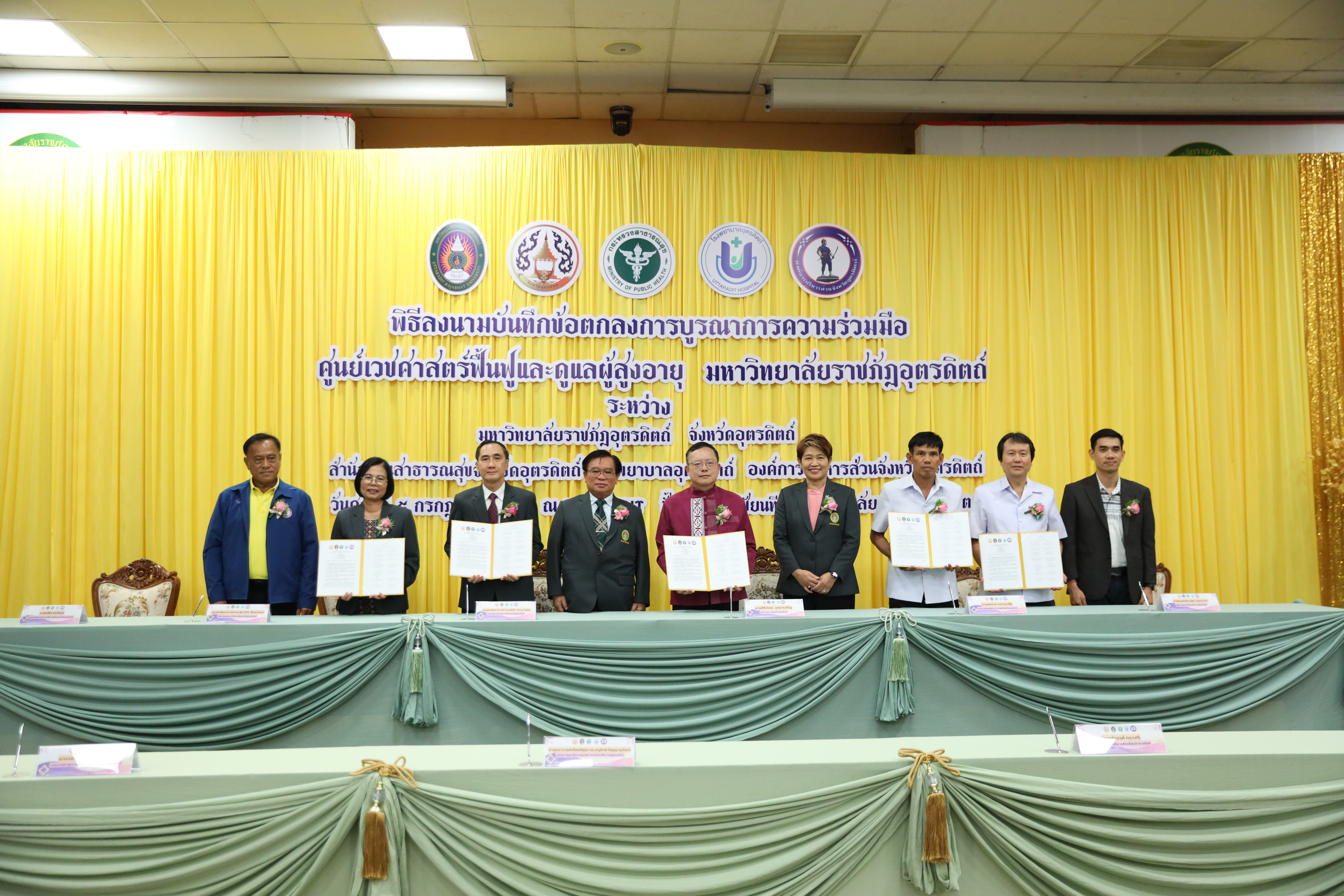 วันที่ 5 กรกฎาคม 2567 สำนักงานจังหวัดอุตรดิตถ์ มหาวิทยาลัยราชภัฏอุตรดิตถ์ สำนักงานสาธารณสุขจังหวัดอุตรดิตถ์ โรงพยาบาลอุตรดิตถ์ และองค์การบริหารส่วนจังหวัดอุตรดิตถ์ จัดพิธีลงนามบันทึกข้อตกลงการบูรณาการความร่วมมือ (MOA) ระหว่าง มหาวิทยาลัยราชภัฏอุตรดิตถ์ กับหน่วยงานพันธมิตรระดับจังหวัด (โครงการศูนย์เวชศาสตร์ฟื้นฟูและดูแลผู้สูงอายุ ณ มหาวิทยาลัยราชภัฏอุตรดิตถ์) โดยมี นายศิริวัฒน์ บุปผาเจริญ ผู้ว่าราชการจังหวัดอุตรดิตถ์ และ รองศาสตราจารย์ ดร.พินิติ รตะนานุกูล นายกสภามหาวิทยาลัยราชภัฏอุตรดิตถ์ ร่วมเป็นประธานในพิธี โดยมีหัวหน้าส่วนราชการเป็นผู้ลงนามในบันทึกข้อตกลงการบูรณาการความร่วมมือ ได้แก่ *นายศิริวัฒน์ บุปผาเจริญ ผู้ว่าราชการจังหวัดอุตรดิตถ์ *รองศาสตราจารย์ ดร.พินิติ รตะนานุกูล นายกสภามหาวิทยาลัยราชภัฏอุตรดิตถ์ *รองศาสตราจารย์ ดร.สุภาวิณี สัตยาภรณ์ อธิการบดีมหาวิทยาลัยราชภัฏอุตรดิตถ์ และ *นายแพทย์อายุส ภมะราภา ผู้อำนวยการโรงพยาบาลอุตรดิตถ์ *ศาสตราจารย์เกียรติคุณ ดร.อนุรักษ์ ปัญญานุวัฒน์ กรรมการสภามหาวิทยาลัยผู้ทรงคุณวุฒิ มรอ. ( พยาน) *นางวรนุชนันท์ พงศ์สุรางค์ กรรมการสภามหาวิทยาลัยผู้ทรงคุณวุฒิ มรอ.(พยาน) *นายสมขาย ทองกระสัน รองนายแพทย์สาธารณสุขจังหวัดอุตรดิตถ์ (พยาน) *นายชลิต ธนวัฒน์ รองนายกองค์การบริหารส่วนจังหวัดอุตรดิตถ์(พยาน) โครงการนี้จะเป็นโครงการต้นแบบที่เน้นการสร้างสุขภาวะถ้วนหน้าแก่ผู้สูงอายุ ครอบครัวและชุมชน พัฒนากำลังคน องค์ความรู้และนวัตกรรมด้านผู้สูงอายุบนพื้นฐานความร่วมมือระหว่าง หน่วยงานในพื้นที่ ได้ใช้ประโยชน์จากฐานทรัพยากรร่วมกันให้แก่มวลชน โดยมหาวิทยาลัยราชภัฏอุตรดิตถ์ จะดำเนินการภายใต้พันธกิจสัมพันธ์ อย่างบูรณาการงานร่วมกันกับจังหวัดอุตรดิตถ์ โรงพยาบาลอุตรดิตถ์ สำนักงานสาธารณสุขจังหวัดอุตรดิตถ์ องค์การบริหารส่วนจังหวัดอุตรดิตถ์ สำนักงานจังหวัดอุตรดิตถ์ในฐานะผู้แทนขององค์กรปกครองส่วนท้องถิ่นและหน่วยงานระดับจังหวัดที่เกี่ยวข้อง ซึ่งจะประสานงานกับส่วนงานอื่นๆ ที่เกี่ยวข้องทั้งในพื้นที่จังหวัดอุตรดิตถ์ และในเขตภาคเหนือตอนล่าง 1 รวมทั้งจังหวัดแพร่ และจังหวัดน่าน เพื่อช่วยกันดำเนินการให้ศูนย์เวชศาสตร์ฟื้นฟูและดูแลผู้สูงอายุ นี้ เป็นต้นแบบการบริการแก่กลุ่มเป้าหมายที่เป็นผู้สูงอายุ และกลุ่มผู้พักพิงที่เพิ่มจำนวนมากขึ้น กับครอบครัวและชุมชนให้มีคุณภาพชีวิตที่ดีและมีความสุขต่อไป การทำบันทึกความเข้าใจข้อตกลงนี้ เป็นการแสดงเจตจำนงที่จะส่งเส