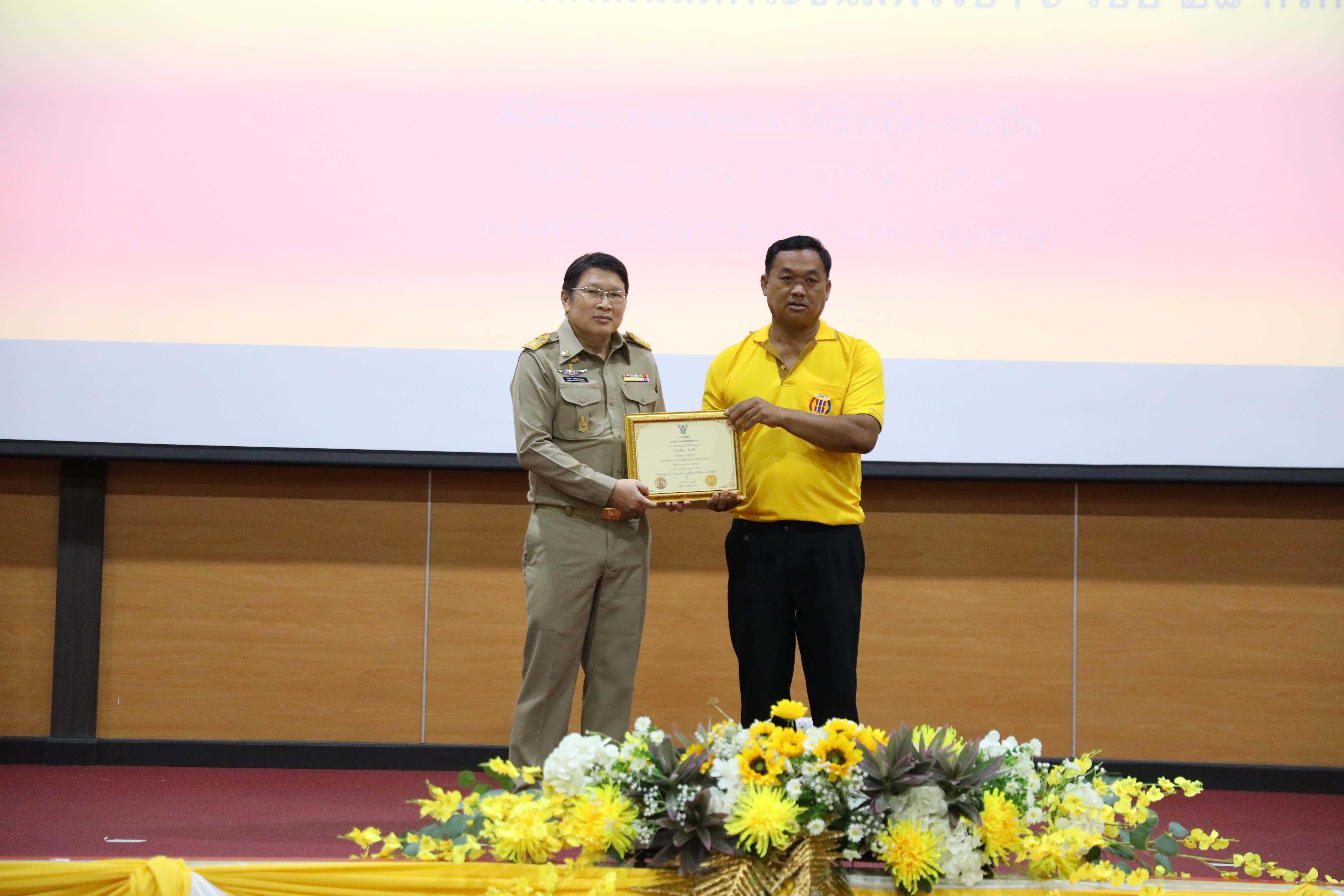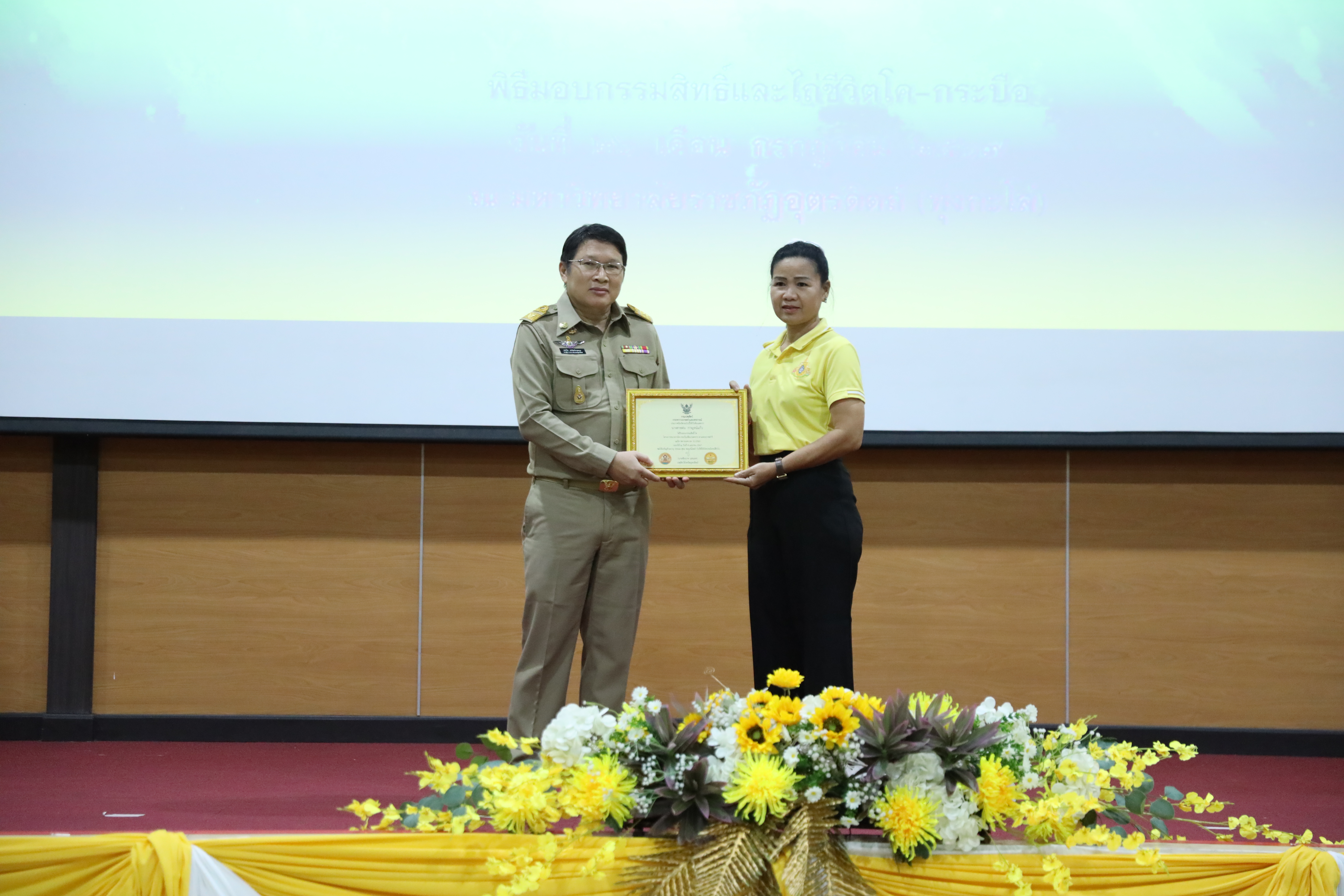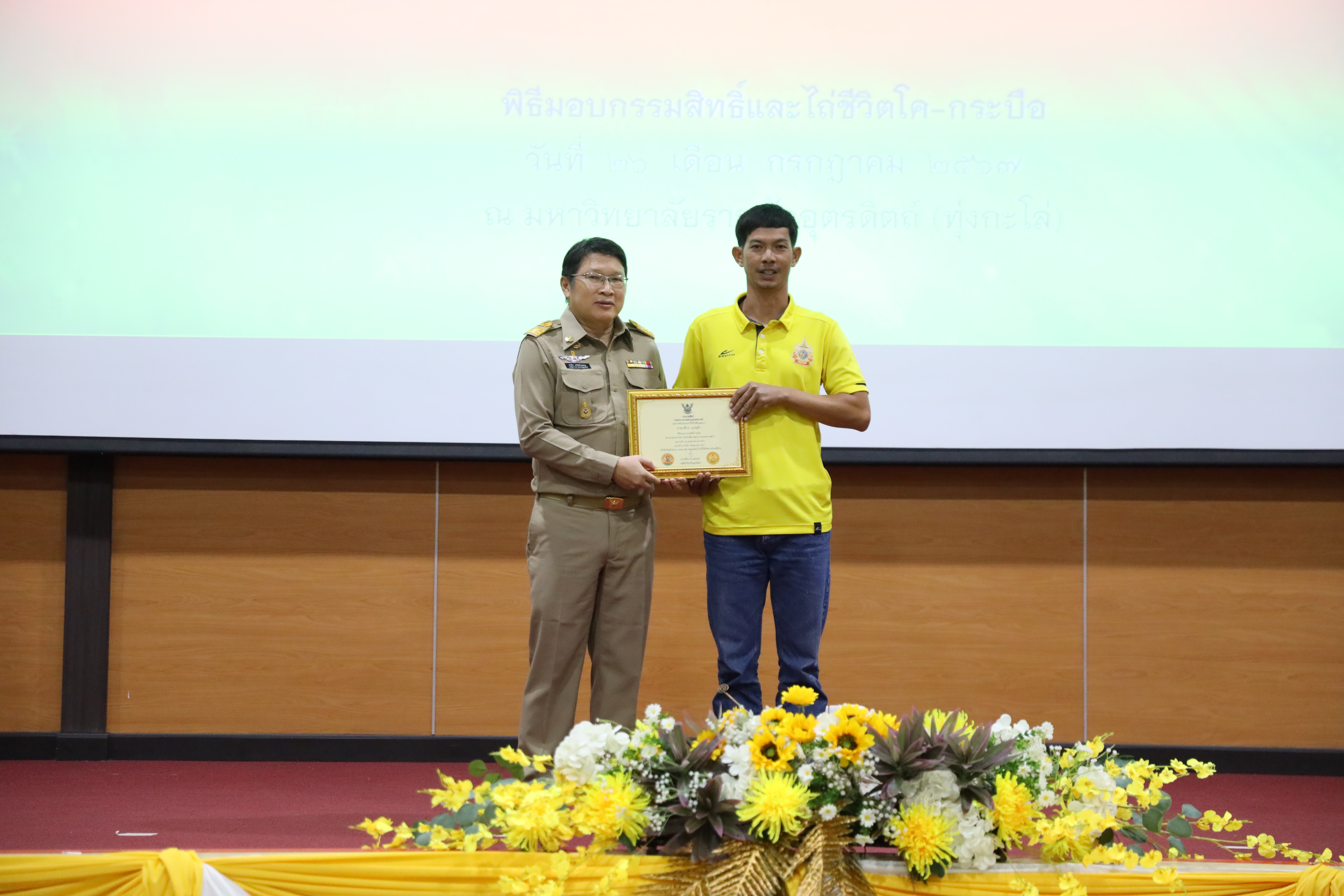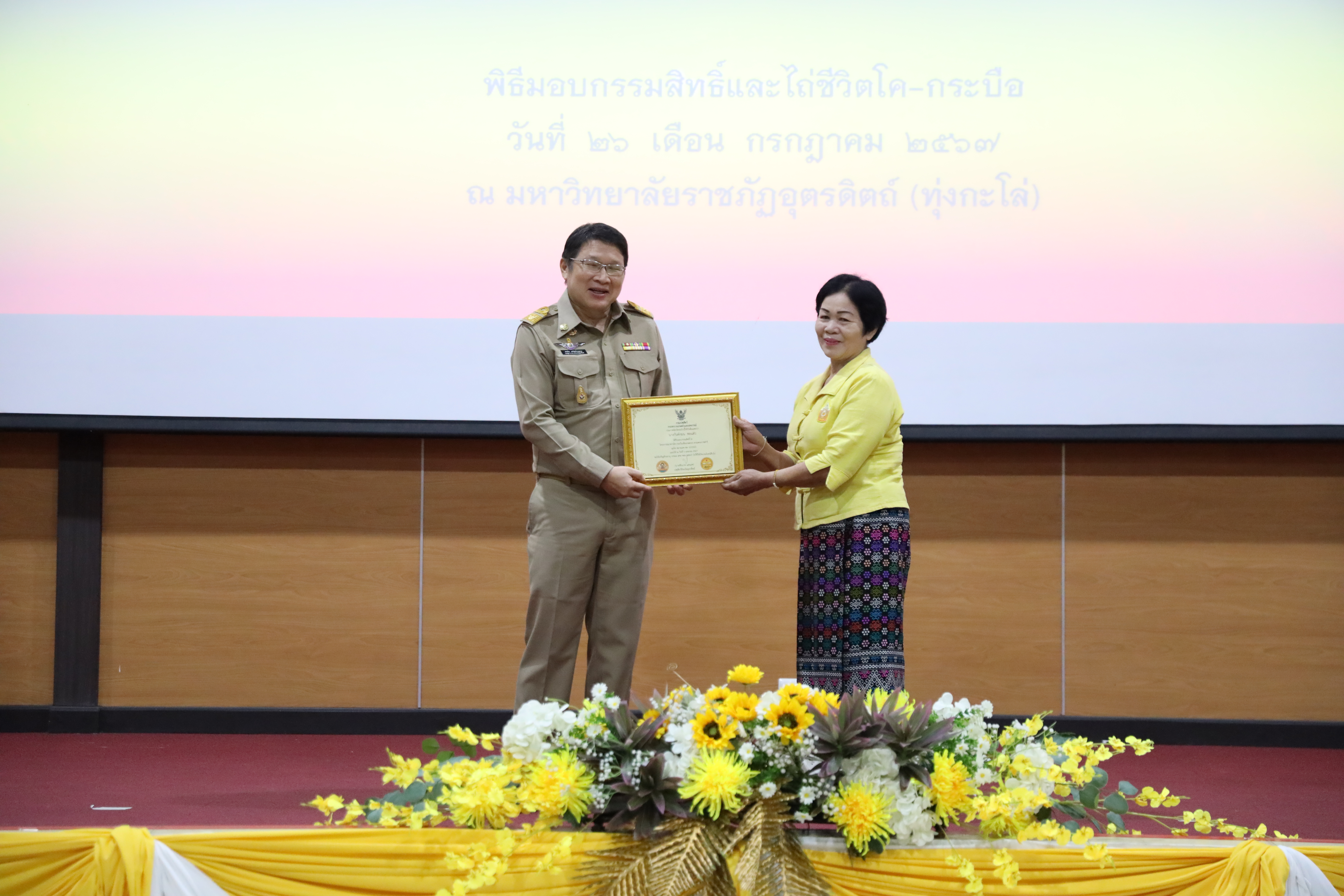 วันที่ 26 กรกฎาคม 2567 มหาวิทยาลัยราชภัฏอุตรดิตถ์และปศุสัตว์จังหวัดอุตรดิตถ์ จัดโครงการมอบกรรมสิทธิ์และไถ่ชีวิตโค-กระบือเฉลิมพระเกียรติพระบาทสมเด็จพระเจ้าอยู่หัว เนื่องในโอกาสพระราชพิธีมหามงคลเฉลิมพระชนมพรรษา 6 รอบ ณ มหาวิทยาลัยราชภัฏอุตรดิตถ์ (ทุ่งกะโล่) จังหวัดอุตรดิตถ์ โดยได้รับเกียรติจาก นายสหวิช อภิชัยวิศรุตกุล รองผู้ว่าราชการจังหวัดอุตรดิตถ์ เป็นประธานในพิธี กล่าวรายงานถึงวัตถุประสงค์ โดย นายชัยนาท แสนยศ ปศุสัตว์จังหวัดอุตรดิตถ์ และกล่าวต้อนรับผู้เข้าร่วมงานโดย รศ.ดร.สุภาวิณี สัตยาภรณ์ อธิการบดี มีกิจกรรมดำเนินการ 2 กิจกรรม ประกอบด้วย 1. การมอบกรรมสิทธิ์โค-กระบือแก่เกษตรกร ที่ปฏิบัติตามเงื่อนไขของโครงการธนาคารโค-กระบือ ตามพระราชดำริซึ่งจังหวัดอุตรดิตถ์มีเกษตรกรที่ได้รับมอบกรรมสิทธิ์โค-กระบือจำนวน ๑๒๗ ราย 2. การไถ่ชีวิตโค-กระบือ เพศเมีย จำนวน 75 ตัว และลูกโค-กระบือ จำนวน 14 ตัว รวม 89 ตัว โดยสำนักงานปศุสัตว์จังหวัดอุตรดิตถ์จะนำไปให้ความช่วยเหลือแก่เกษตรกรภายใต้ระเบียบและหลักเกณฑ์ของโครงการธนาคาร โค-กระบือเพื่อเกษตรกรตามพระราชดำริและการไถ่ชีวิตโค-กระบือ จำนวน 56 ตัวเพื่อส่งเสริมอาชีพการเลี้ยงโคเนื้อ รวม 2 โครงการ โค-กระบือ รวมทั้งสิ้น จำนวน 145 ตัว ซึ่งจะทำให้เกษตรกรที่ได้รับมอบโค-กระบือในวันนี้มีอาชีพและ มีรายได้ที่มั่นคงต่อไป โครงการธนาคารโค-กระบือเพื่อเกษตรกร ตามพระราชดำริเป็นหนึ่งในโครงการพระราชดำริของพระบาทสมเด็จพระบรมชนกาธิเบศรมหาภูมิพลอดุลยเดชมหาราชบรมนาถบพิตร ซึ่งกรมปศุสัตว์รับสนองพระราชดำริดำเนินการมาตั้งแต่ปีพุทธศักราช 2522 เพื่อช่วยเหลือเกษตรกรให้มีโค-กระบือไว้ใช้แรงงานและเพิ่มผลผลิตทางการเกษตรจากการดำเนินงานที่ผ่านมากรมปศุสัตว์ได้ให้ความช่วยเหลือเกษตรกรไปแล้วไม่น้อยกว่า 375,564 ราย และมีการมอบกรรมสิทธิ์ โค-กระบือให้แก่เกษตรกรไปแล้วไม่น้อยกว่า 134,430 ราย คิดเป็นมูลค่ากว่า 2,800 ล้านบาท และยังมีเกษตรกรอยู่ในความดูแลของโครงการกว่า 116,907 ราย จำนวนโค-กระบือ 133,421 ตัว โครงการธนาคารโค-กระบือ เพื่อเกษตรกรตามพระราชดำริถือได้ว่าเป็นโครงการที่สามารถแก้ไขปัญหาความยากจนของเกษตรกรโดยการน้อมนำหลักปรัชญา ของเศรษฐกิจพอเพียงมาปรับใช้ในการดำเนินงานกอปรกับมีการทำงานบูรณาการร่วมกันในพื้นที่อย่างเป็นระบบสนับสนุนให้มีการรวมกลุ่มของเกษตรกรและให้ชุมชนมีส่วนร่วมในการบริหารโครงการเพื่อให้เกิดความเข้มแข็ง/ตลอดจนมีการต่อยอดการใช้ประโยชน์ เช่นการใช้มูลสัตว์เป็นปุ๋ยในไร่นาการทำแก๊สชีวภ