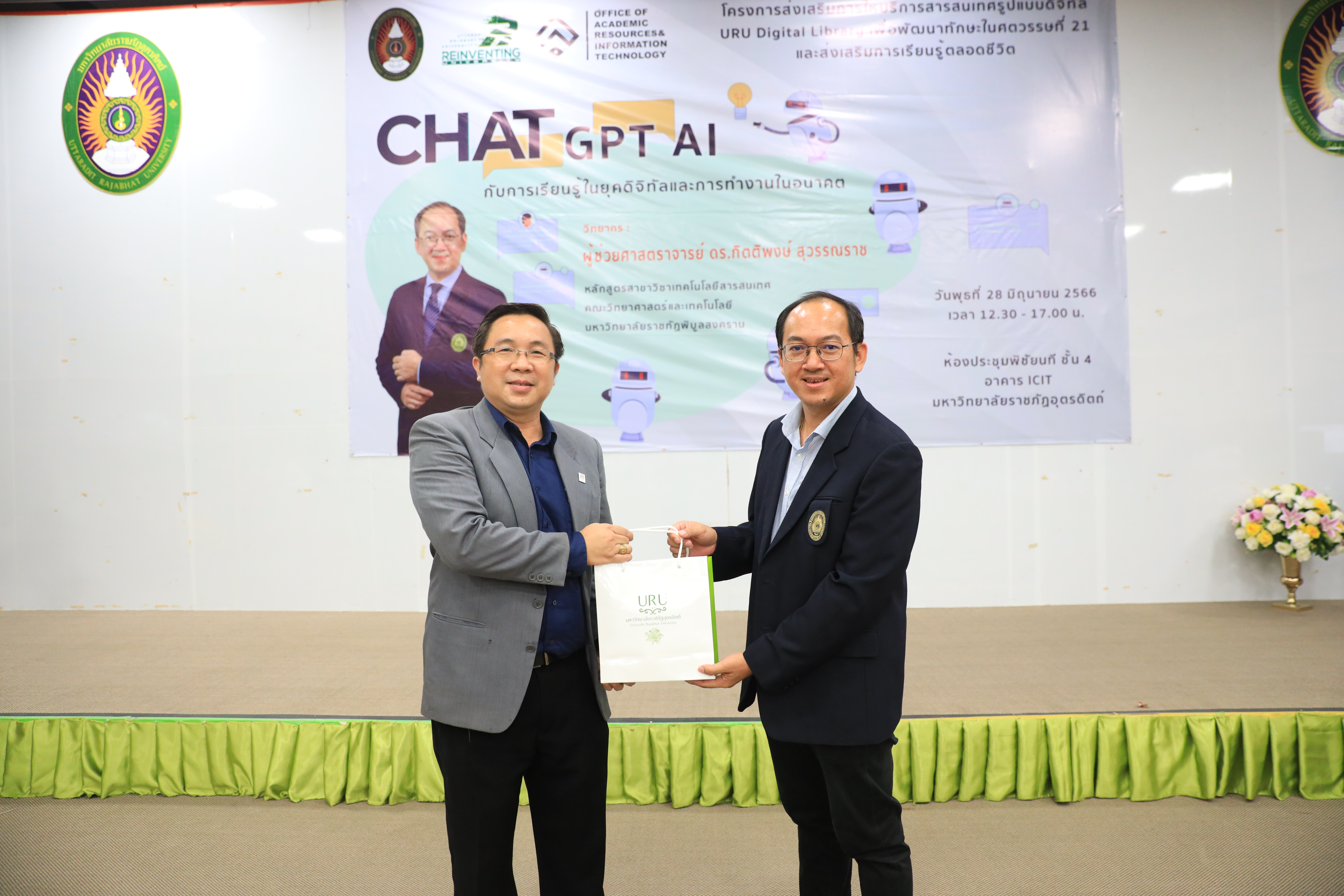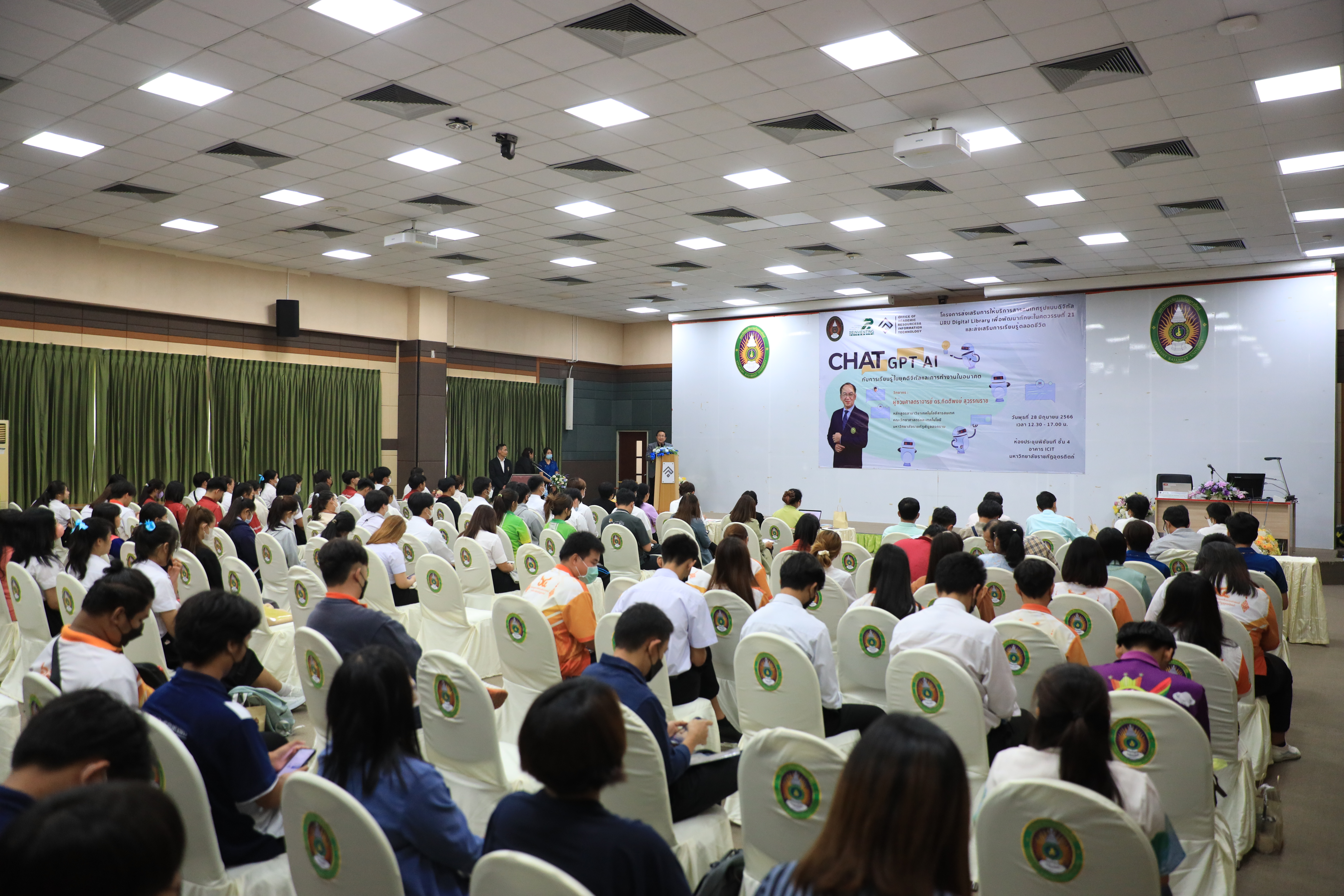 วันที่ 28 มิถุนายน 2566 สำนักวิทยบริการฯ จัดโครงการส่งเสริมการให้บริการสารสนเทศรูปแบบดิจิทัล URU Digital Library เพื่อพัฒนาทักษะในศตวรรษที่ 21 และส่งเสริมการเรียนรู้ตลอดชีวิต ณ ห้องประชุมพิชัยนที ชั้น 4 อาคาร ICIT มหาวิทยาลัยราชภัฏอุตรดิตถ์ โดยมี อาจารย์ ดร. พิสุทธิ์ ศรีจันทร์ ผู้อำนวยการสำนักวิทยบริการและเทคโนโลยีสารสนเทศ กล่าวเปิดโครงการ ละโครงการครั้งนี้ได้รับเกียรติจาก ผู้ช่วยศาสตราจารย์ ดร.กิตติพงษ์ สุวรรณราช อาจารย์ประจำสาขาเทคโนโลยีสารสนเทศ คณะวิทยาศาสตร์และเทคโนโลยี มหาวิทยาลัยราชภัฏพิบูลสงคราม เป็นวิทยาการบรรยายพิเศษเรื่อง ChatGPT AI กับการเรียนรู้ในยุคดิจิทัลและ การทำงานในอนาคต ภาพ/ข่าว PR URU